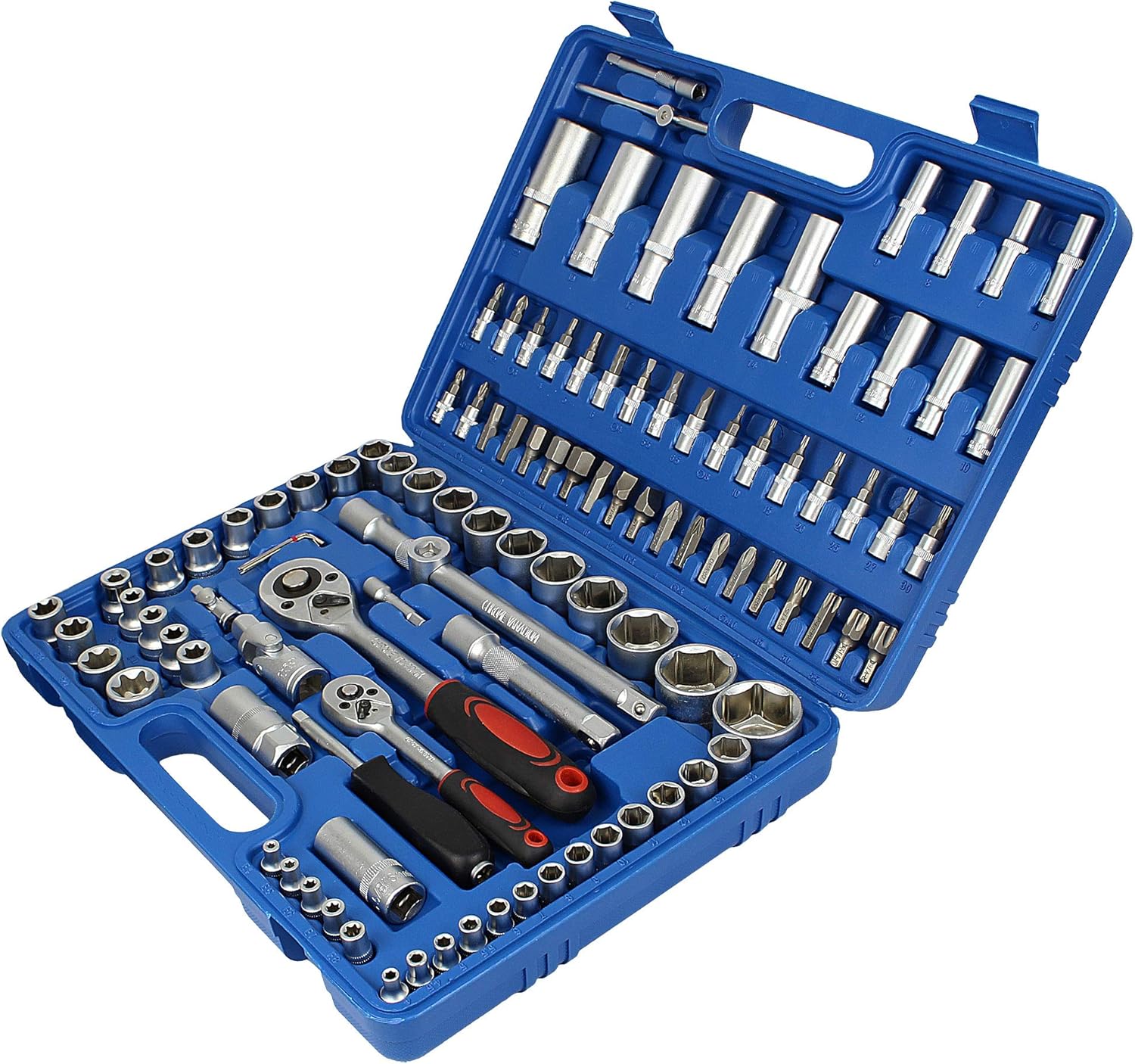Sav alat dolazi uredno raspoređen u čvrstom plastičnom koferu koji omogućava lako čuvanje i brz pristup svakom delu seta. Svaki nastavak ima svoje mesto, pa nema rasipanja i gubljenja delova.