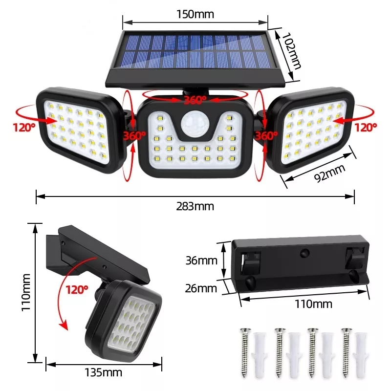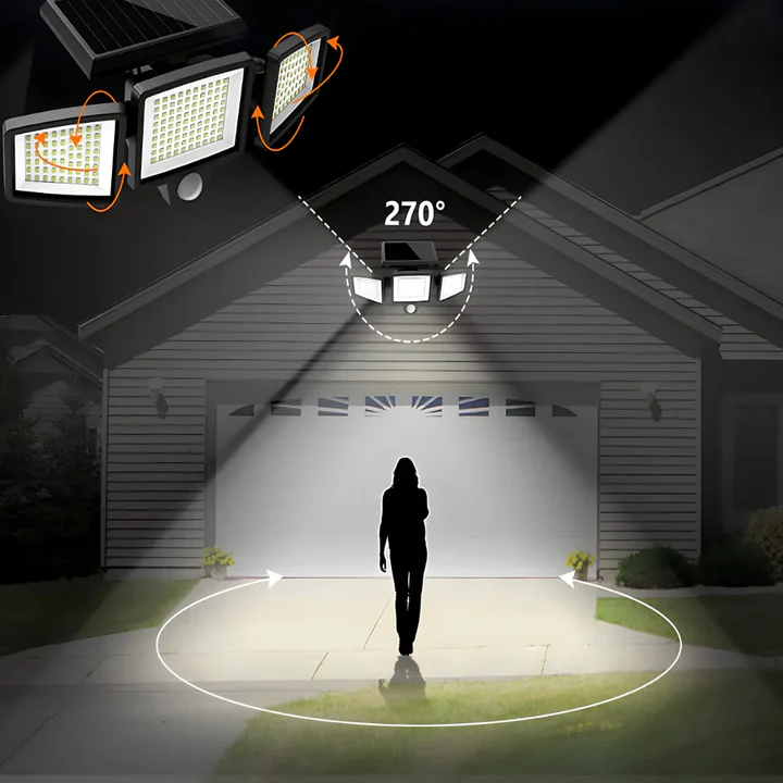 Solarni LED Reflektor sa Senzorom Pokreta i 3 Rotirajuće Glave – Maksimalno Osvetljenje Bez Troškova Struje!