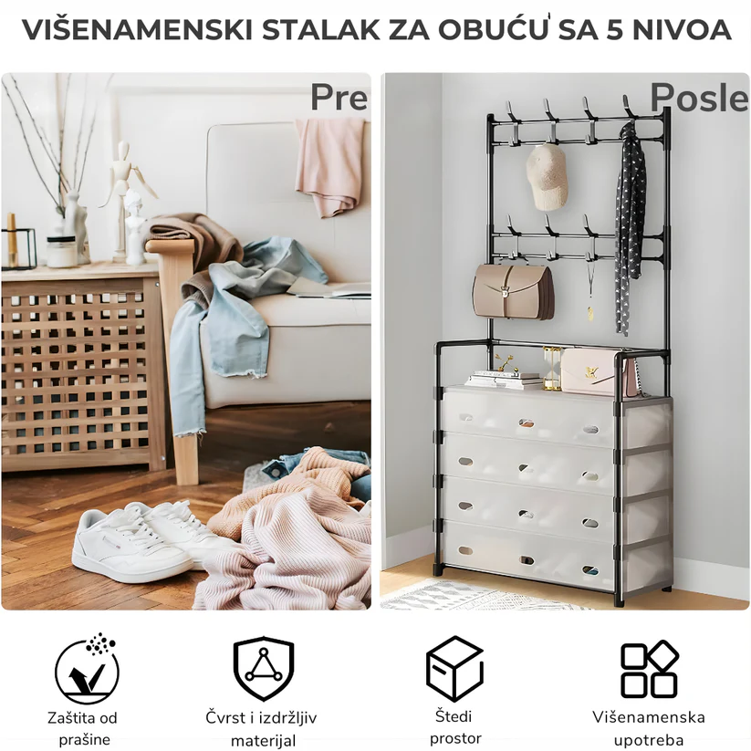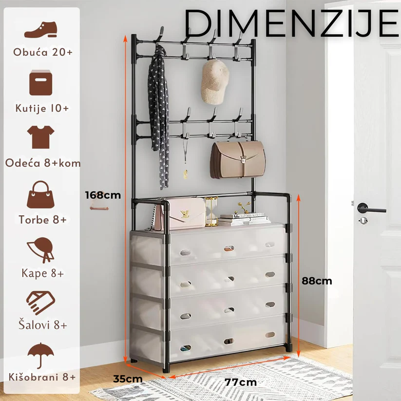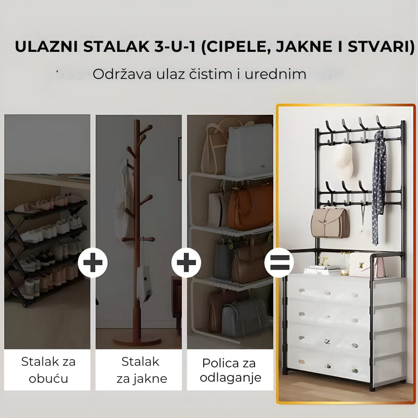 Višenamenski cipelarnik 3-u-1 donosi pametno rešenje za odlaganje obuće, jakni, torbi i dodataka, bez zauzimanja mnogo prostora.